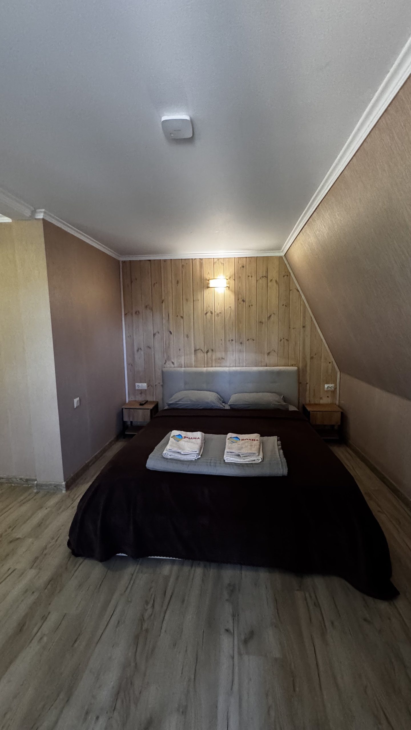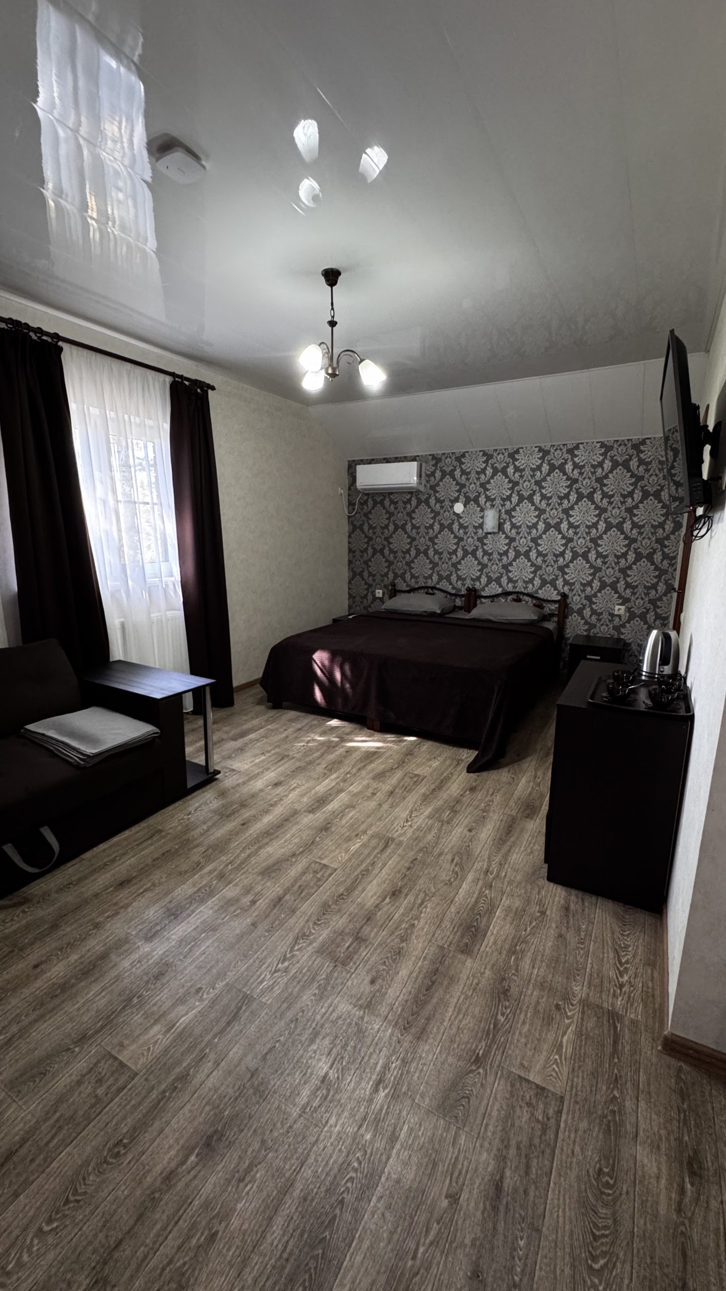 1-но комнатный, четырёхместный номер (комната с двуспальной кроватью + диван), комплект для чаепития на 4 персоны, холодильник, чайник, телевизор с ПДУ, сплит-система с ПДУ.