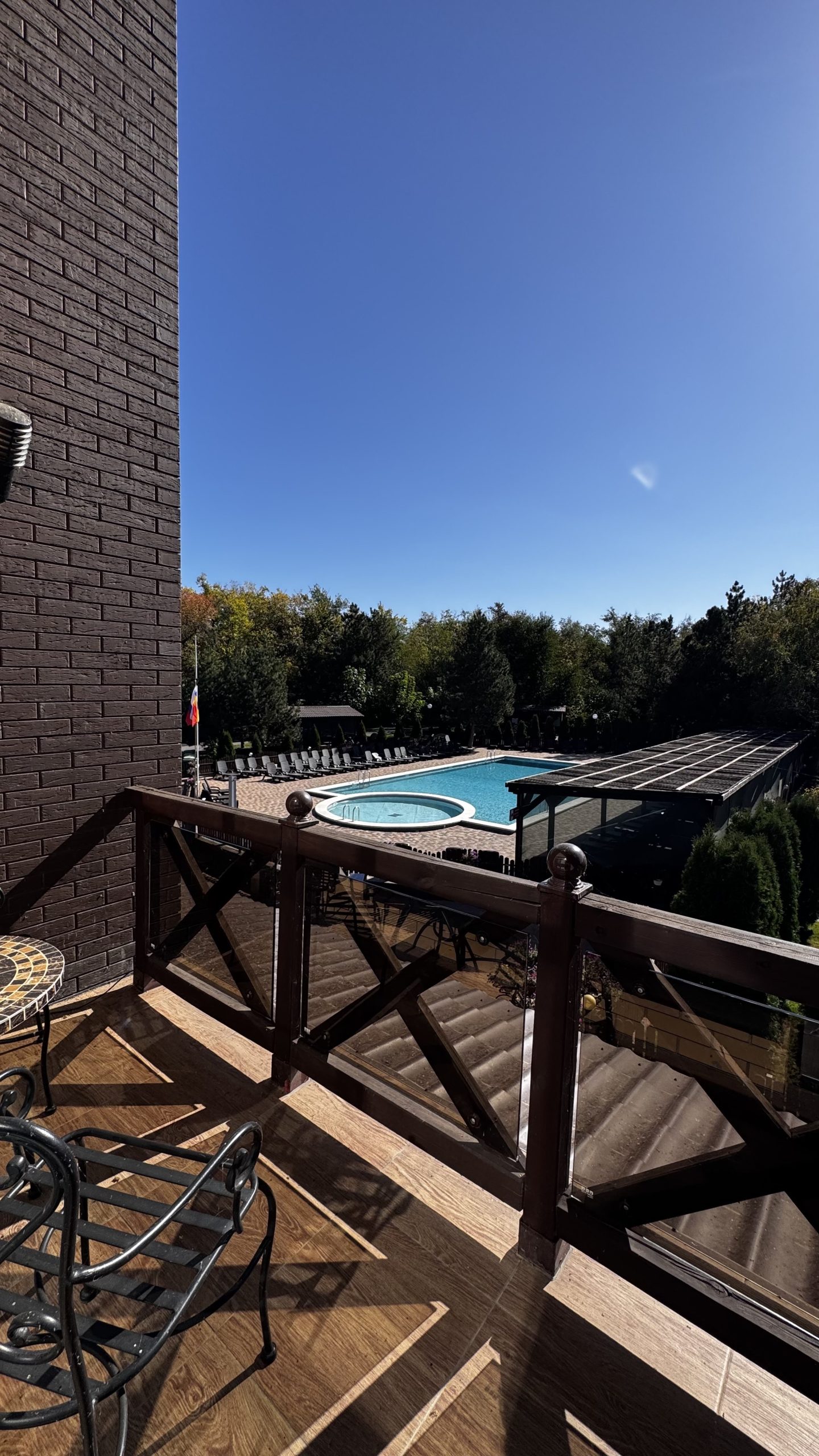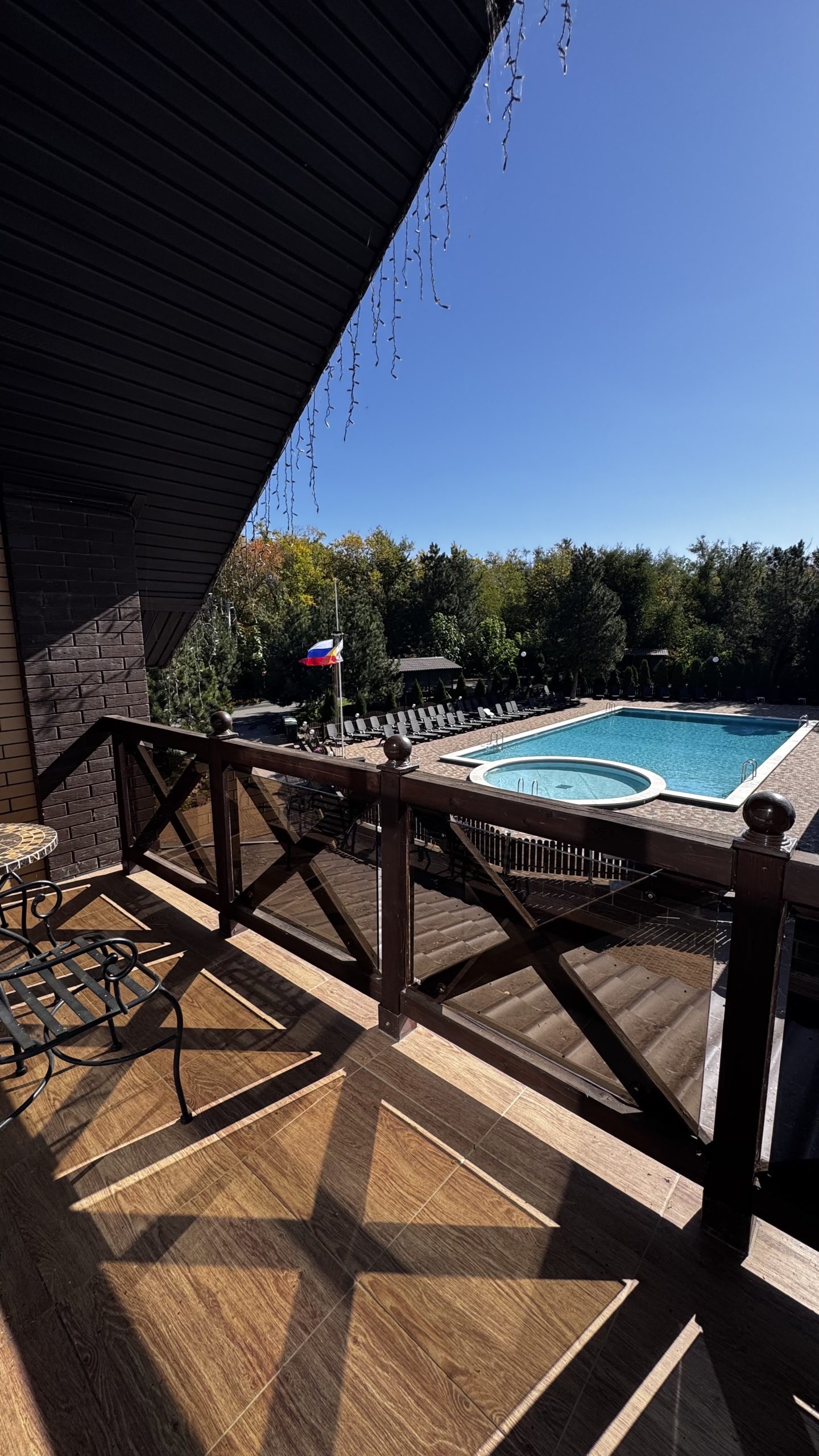 1-но комнатный двухместный номер, с балконом и видом на бассейн, расположен на втором этаже, (комната с двуспальной кроватью), ТВ с ПДУ, сплит-система с ПДУ, комплект посуды для чаепития, мини-холодильник, шкаф.